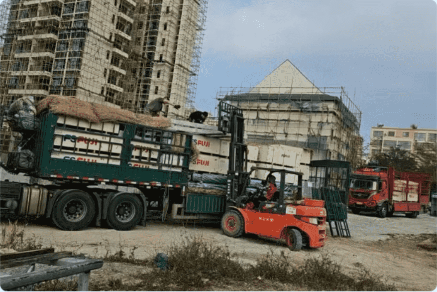Nowadays, brand new elevator equipment is neatly arranged on the construction site, and workers are systematically preparing for installation.